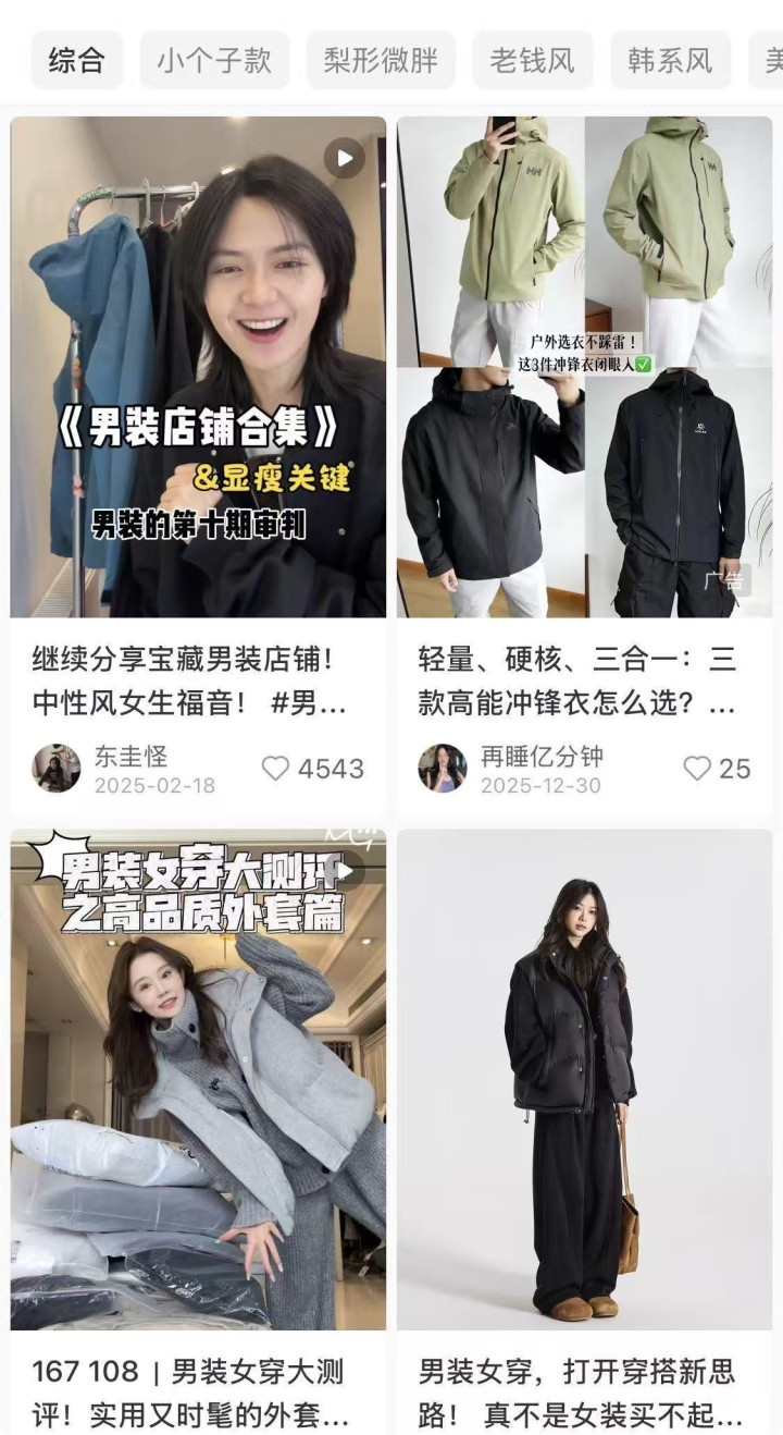 打开社交媒体,不难看到,女性消费者转身男装的动因首要还是性价比。她们说,在同等预算下,男装在用料、做工功能性方面,更为“实在”和耐用。